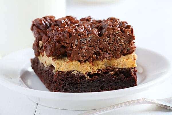 Delicious pumpkin brownies with a rich chocolate flavor and a hint of spice, topped with a peanut butter chocolate rice Krispy layer.