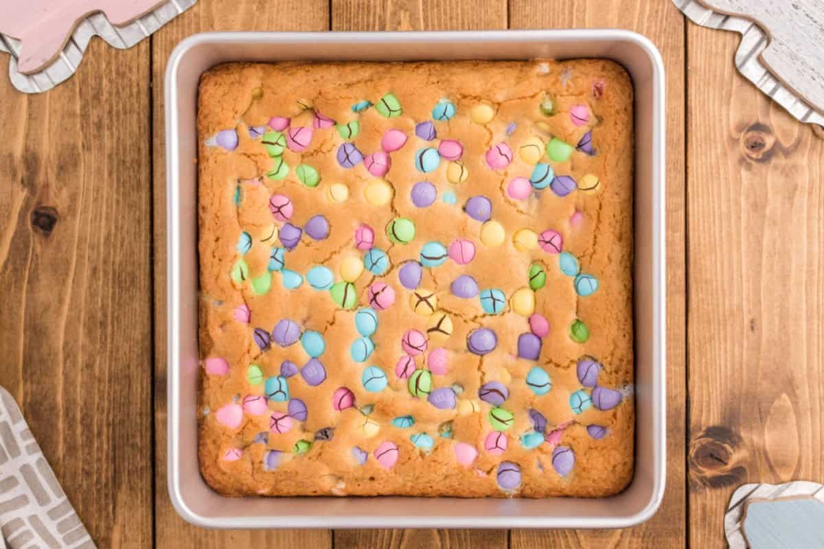 1. Combine brown sugar, melted butter, eggs, and vanilla in a large mixing bowl. Add flour, baking powder, baking soda, and salt. Fold in candy. Line a 9-inch square baking dish with parchment paper. Press dough into pan.