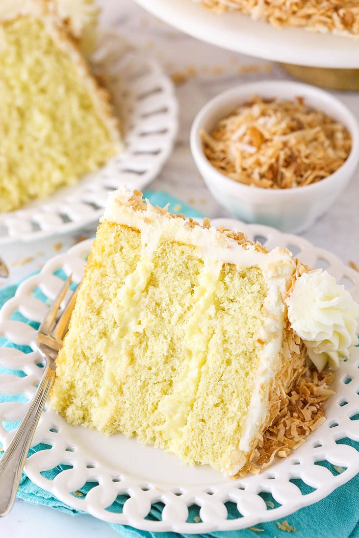 A deliciously moist coconut cake layered with rich coconut filling and topped with creamy frosting.