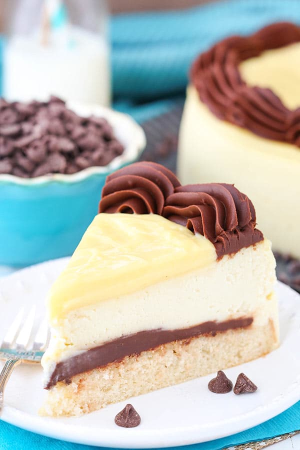 - Assemble the dessert: pipe ganache around the edge of the cheesecake, spread pastry cream in the center, then chill until ready to serve.