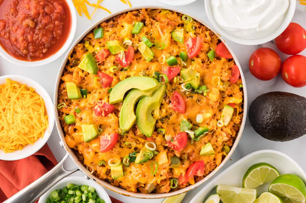 - Once cooked, stir in cheese, avocado, tomatoes and lime juice. Cover again for a couple of minutes until the cheese is melted. Top with green onions and serve.
