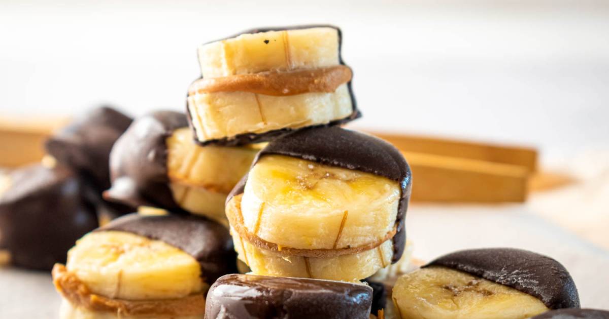 - Dip the frozen banana bites into the melted chocolate and place on a parchment-lined tray.
