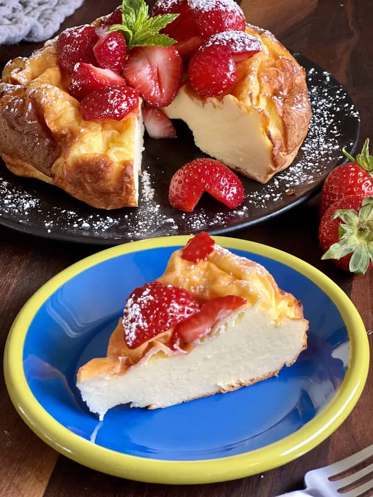 1. *PLEASE NOTE: this recipe is a no sugar added cake. It has a custard like texture. If you want to add sugar to the cake that's cool too, just add 1/4 cup to the yogurt in the beginning and mix it in before adding in the eggs. You can also sub in vanilla Greek yogurt for some sweetness.