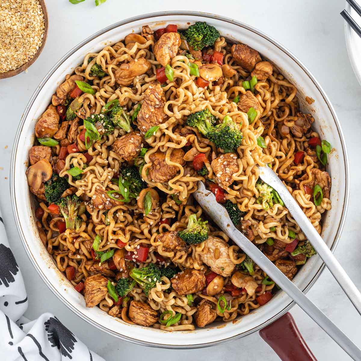 - Return chicken to skillet, add cooked ramen, and pour sauce over. Toss to combine. Serve hot garnished with green onions and sesame seeds if desired.