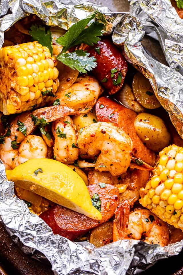 A flavorful grilled shrimp boil cooked in foil packets with potatoes, corn, sausage, and herbs, perfect for outdoor gatherings.