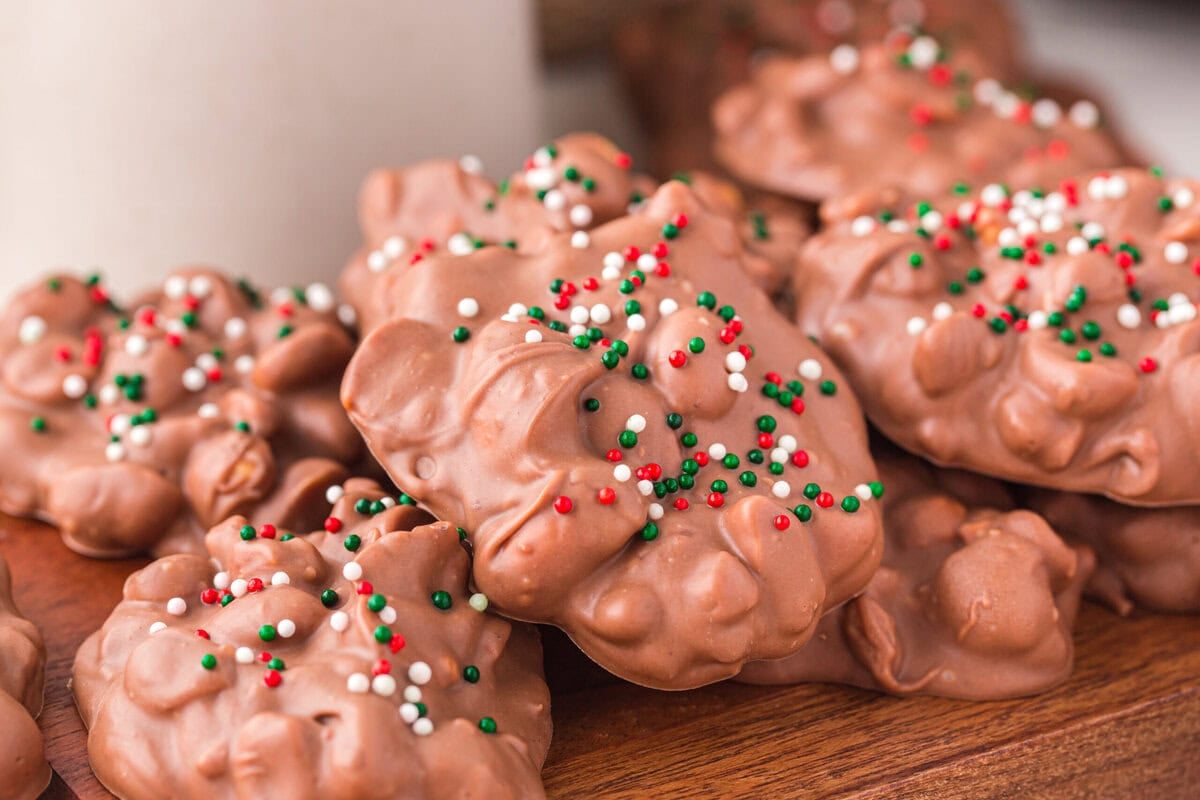 - Once the thirty minutes has passed, drop spoonfuls of the chocolate and peanut mixture onto the parchment paper and sprinkle with festive sprinkles and sea salt, optional. (I love to use a cookie scoop)