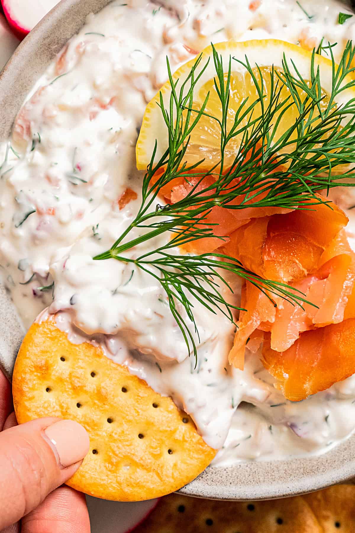 - Fold in the chopped salmon lox, dill, parsley, red onion, and minced garlic.