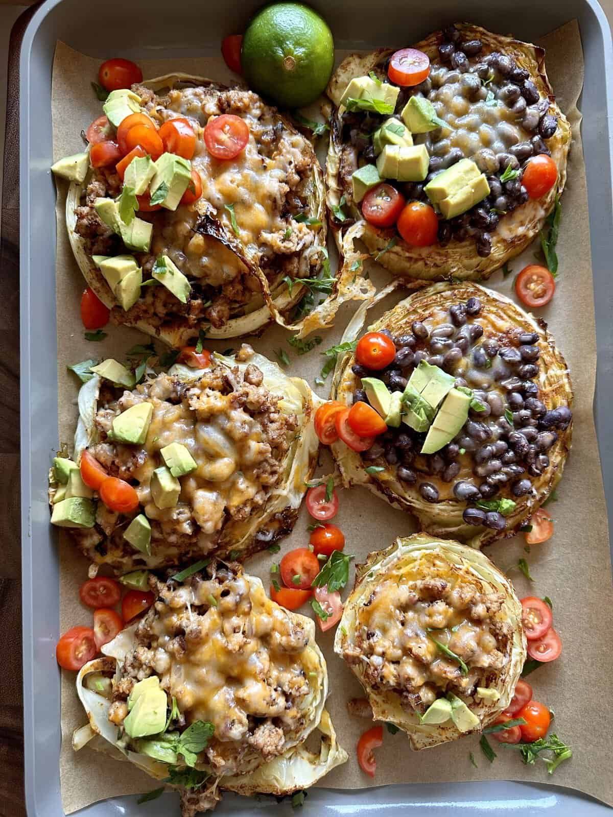 A delicious vegetarian twist on traditional tacos using cabbage steaks topped with spicy meat or veggies.