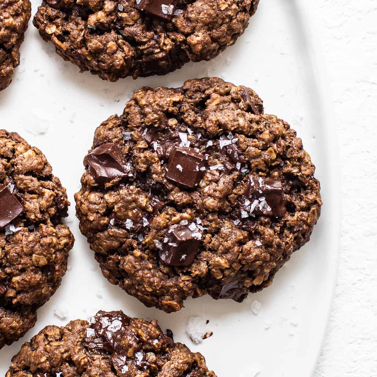 3. Incorporate salt, oats, cocoa powder, and baking soda; stir until combined. Fold in chocolate chunks.