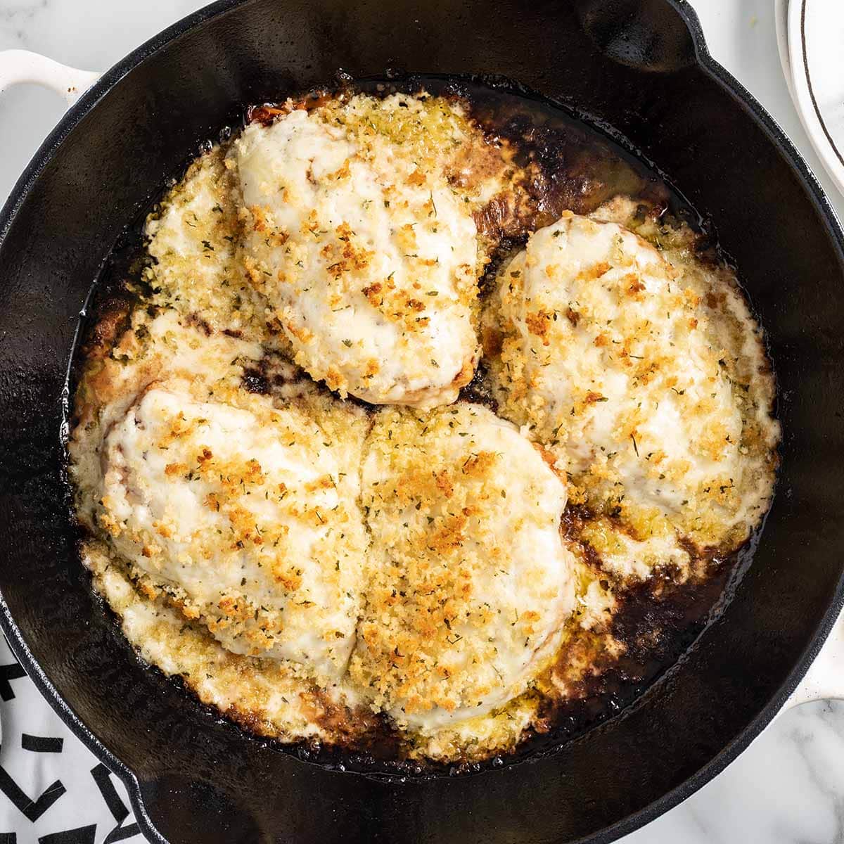 - Reduce heat, add cheese mixture on top of chicken, and sprinkle with breadcrumb mixture.
