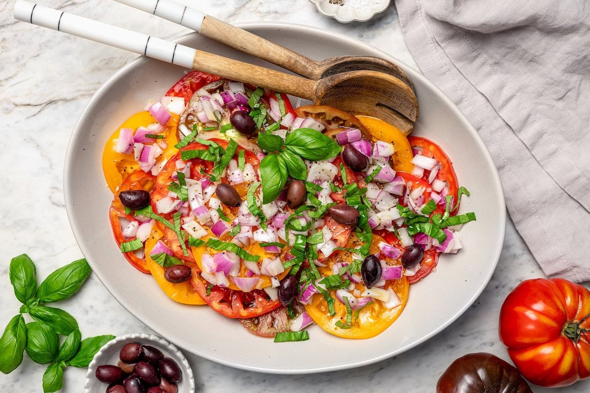 - Pour the marinated onion and olive oil mixture over the sliced tomatoes. Season with additional salt and pepper if desired. Garnish with sliced fresh basil and olives.