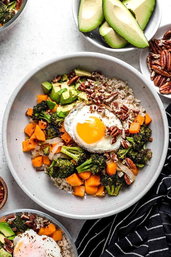 - Divide cooked rice among bowls, top with roasted vegetables, sliced avocado, a fried egg, and sprinkle with pecans.